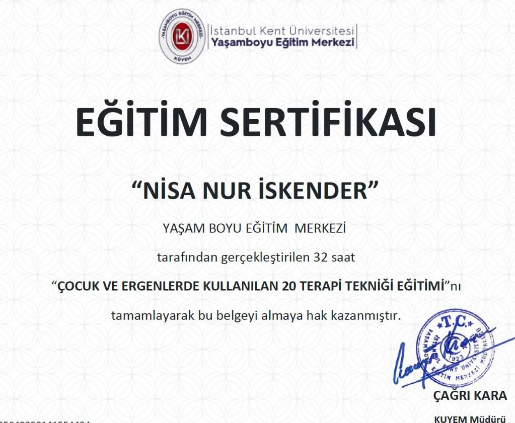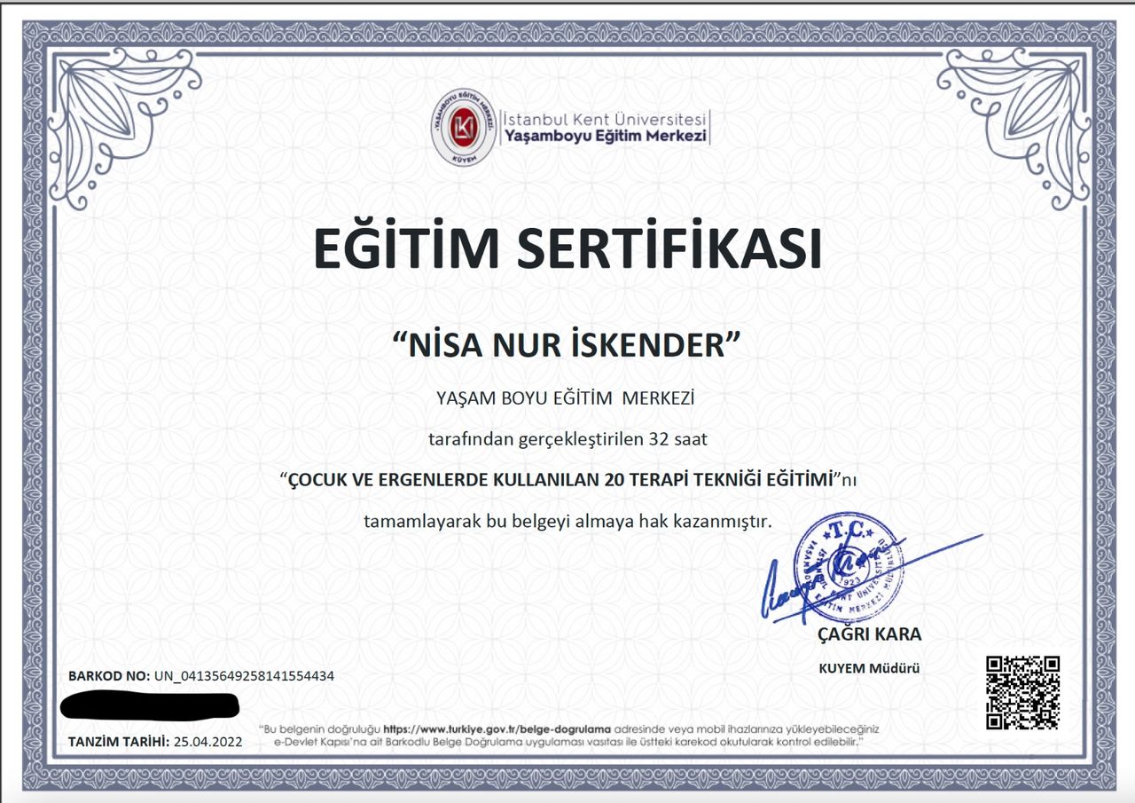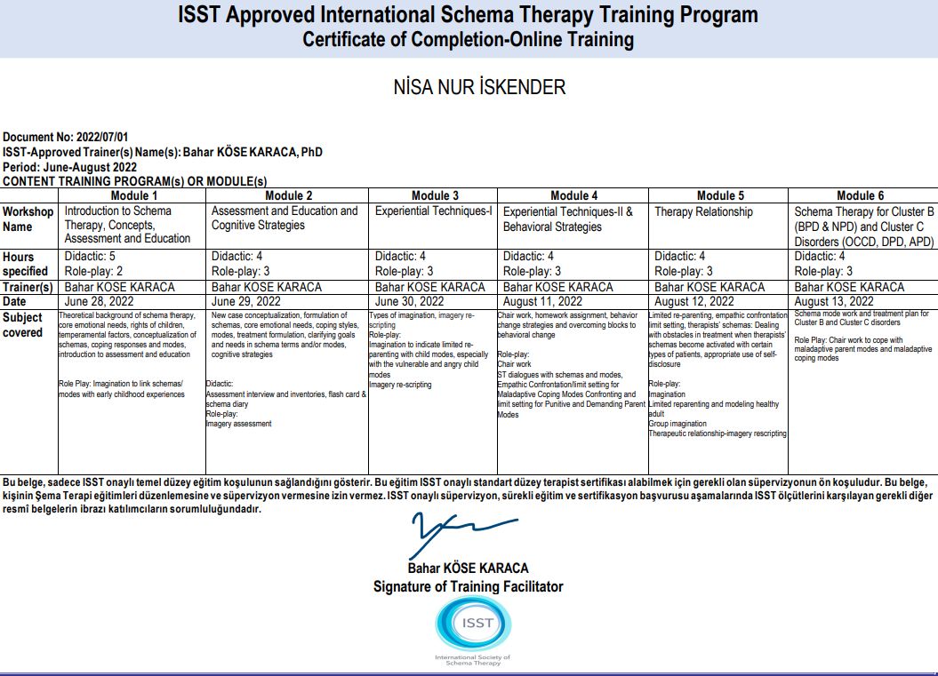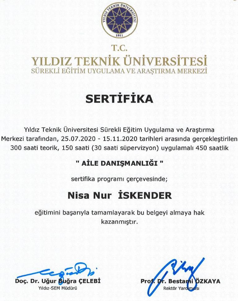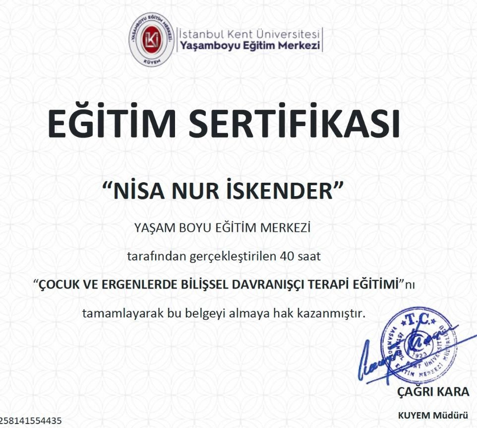 -EĞİTİMLER- Yıldız Teknik Üniversitesi Aile Danışmanlığı Eğitimi (450 saat) Bilişsel Davranışçı Terapi (Prof. Dr. İsmet KIRPINAR) Bilişsel Davranışçı Terapi Süpervizyonu (Prof. Dr. Haşim Ercan ÖZMEN) Kısa Süreli Çözüm Odaklı Terapi (Doç. Dr. Itır Tarı CÖMERT) Kabul ve Kararlılık Terapisi Şema Terapi (Psk. Dr. Bahar Köse KARACA) Çocuk ve Ergenlerde Bilişsel Davranışçı Terapi (Dr. Nevin DÖLEK) Çocuk Merkezli Oyun Terapisi (Mehmet TEBER) Çocuk Değerlendirmede Projektif – Objektif Testler MOXO d-CPT Dikkat Performans Testi Kriz - Travma ve Yas Terapisi Eğitimi Terapötik Kartlar Eğitimi CharacterIX Kişilik Eğitimi Envanteri Rapor Okuma ve Değerlendirme Danışmanlığı WISC-R (Çocuklar için Zeka Testi)