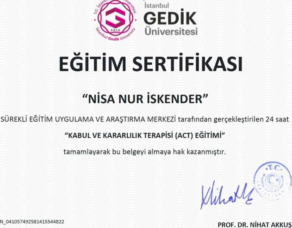 Klinik Psikolog Nisa Nur İskender Psikoloji lisans eğitimini Fatih Sultan Mehmet Vakıf Üniversitesi’nde tamamlamıştır. Öğrencilik yıllarında Muradiye Devlet Hastanesi’nde gönüllü staj yaparak mesleki deneyim kazanmıştır.